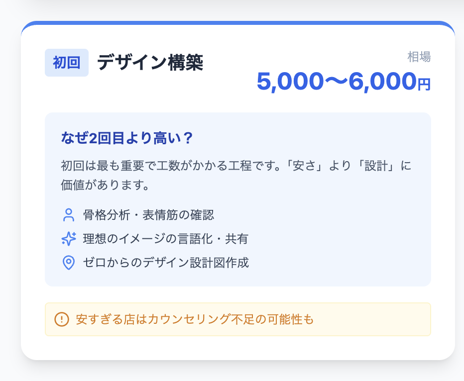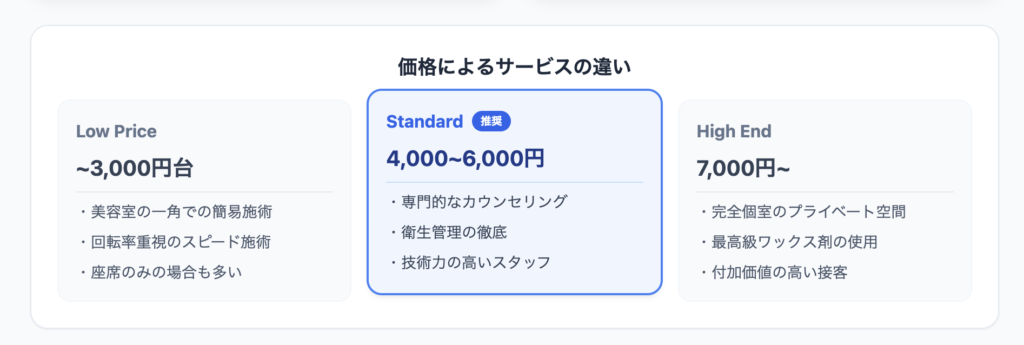 多くのサロンは明朗会計ですが、「指名料(500円〜1,000円)」や「鼻毛ワックス(1,000円〜2,000円)」などのオプションを追加すると総額が変わります。