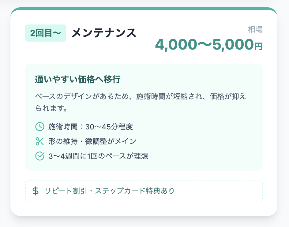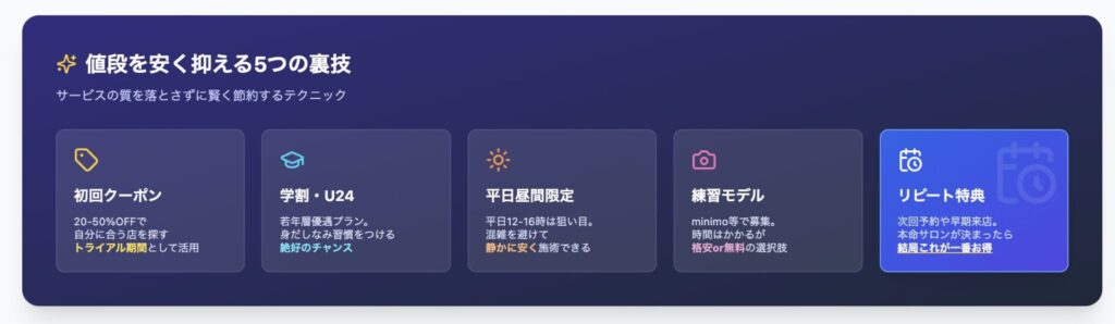 多くのサロンが若年層の顧客を取り込むために、通常料金から500円〜1,000円引き、あるいは一律3,000円台といった優遇プランを設けています。