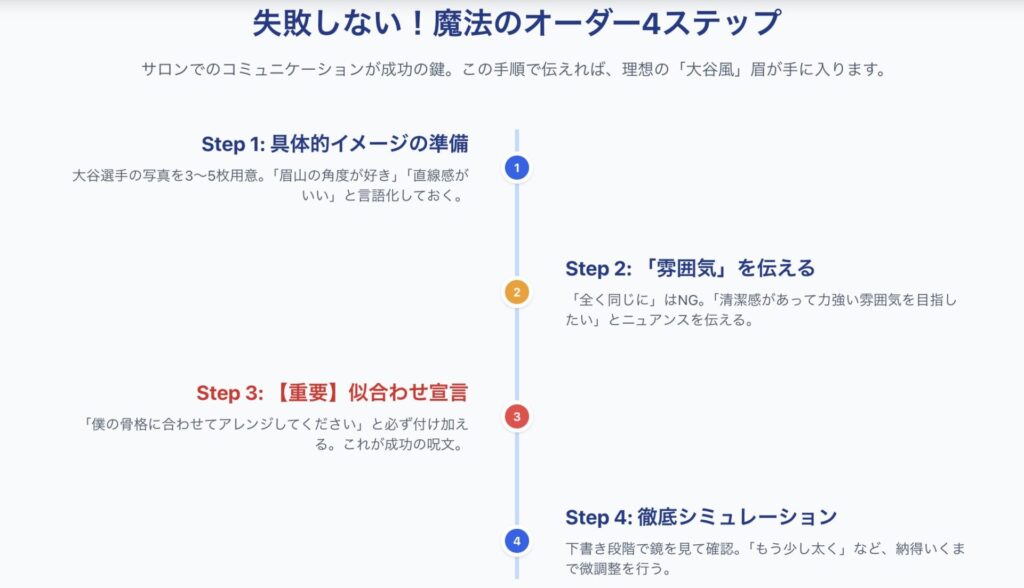 - ステップ③:【重要】「ただし、完全なコピーではなく、『自分に似合う形で』お願いします」と必ず付け加える! これが失敗を防ぐための魔法の言葉です。 「大谷選手の眉毛はあくまで理想ですが、僕自身の骨格や顔立ちに合わせて、プロの視点から見て一番似合う形にアレンジしてほしいんです」と伝えること。 これにより、アイブロウリストはあなたの希望を尊重しつつも、あなただけの骨格や個性を最大限に活かした「最適解」を提案しやすくなります。 「丸投げ」ではなく、「プロの力を借りて、一緒に最高の眉毛を創り上げたい」という姿勢を示すことが大切です。