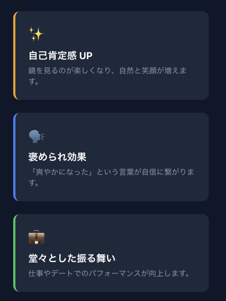 - 周りからの視線が変わる!: 「爽やかになったね!」「なんか キリッとしてカッコよくなった!」。 そんな嬉しい言葉をかけられることが増え、コミュニケーションにも自信が持てるようになります。