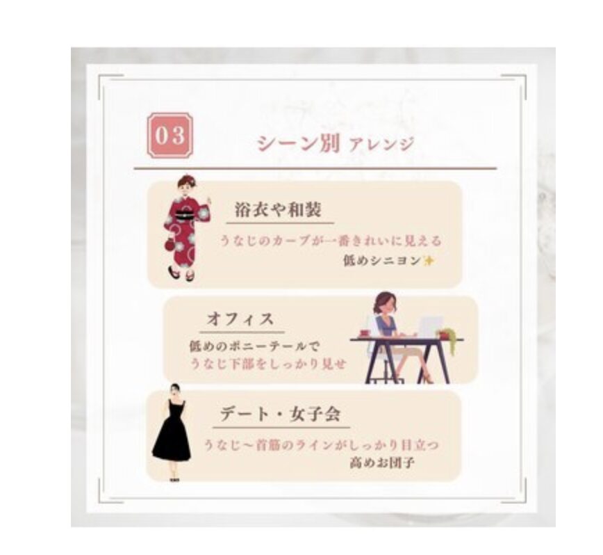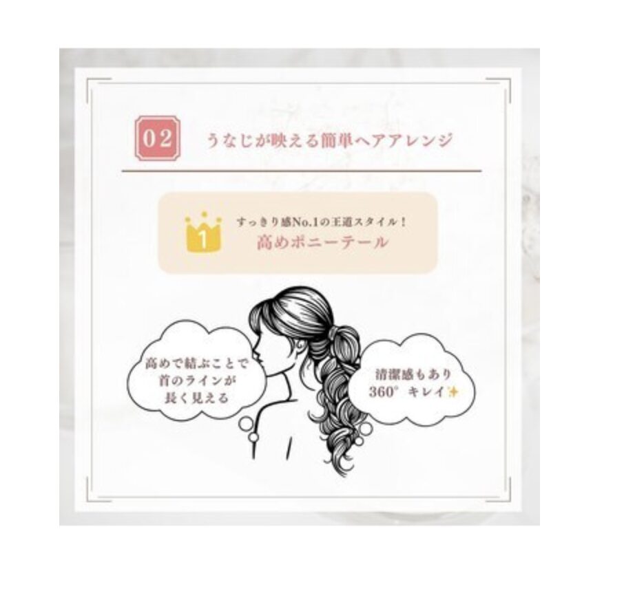自信を持ってうなじを露出できるようになれば、背中の開いたドレスやオフショルダートップスも堂々と着こなせるようになるでしょう。