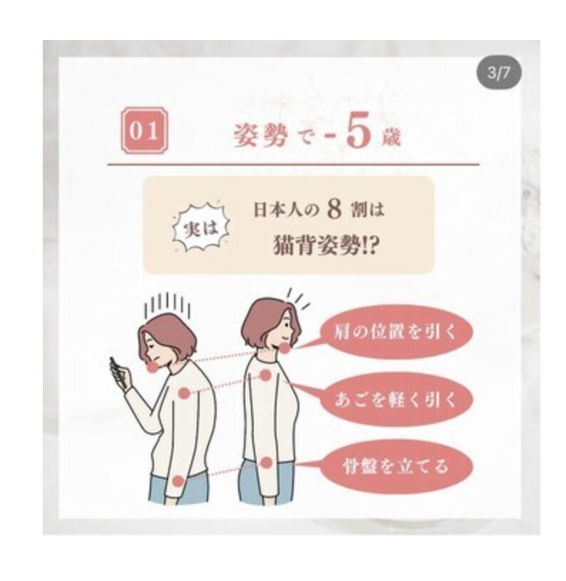 さらに、姿勢が悪いと首の後ろに余計な脂肪がつきやすくなり、いわゆる「おばさん肉」と呼ばれる段差ができてしまう原因にもなりかねません。