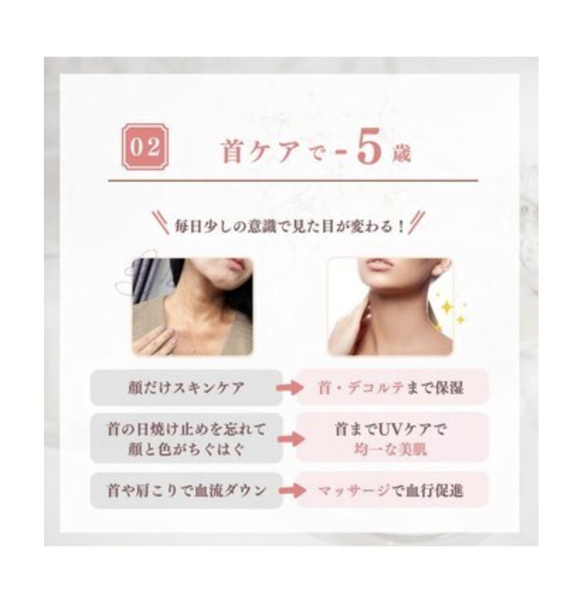 「首までが顔」という意識を持ち、360度どこから見られても恥ずかしくない、吸い付くような肌質を目指してケアを継続することが大切です。